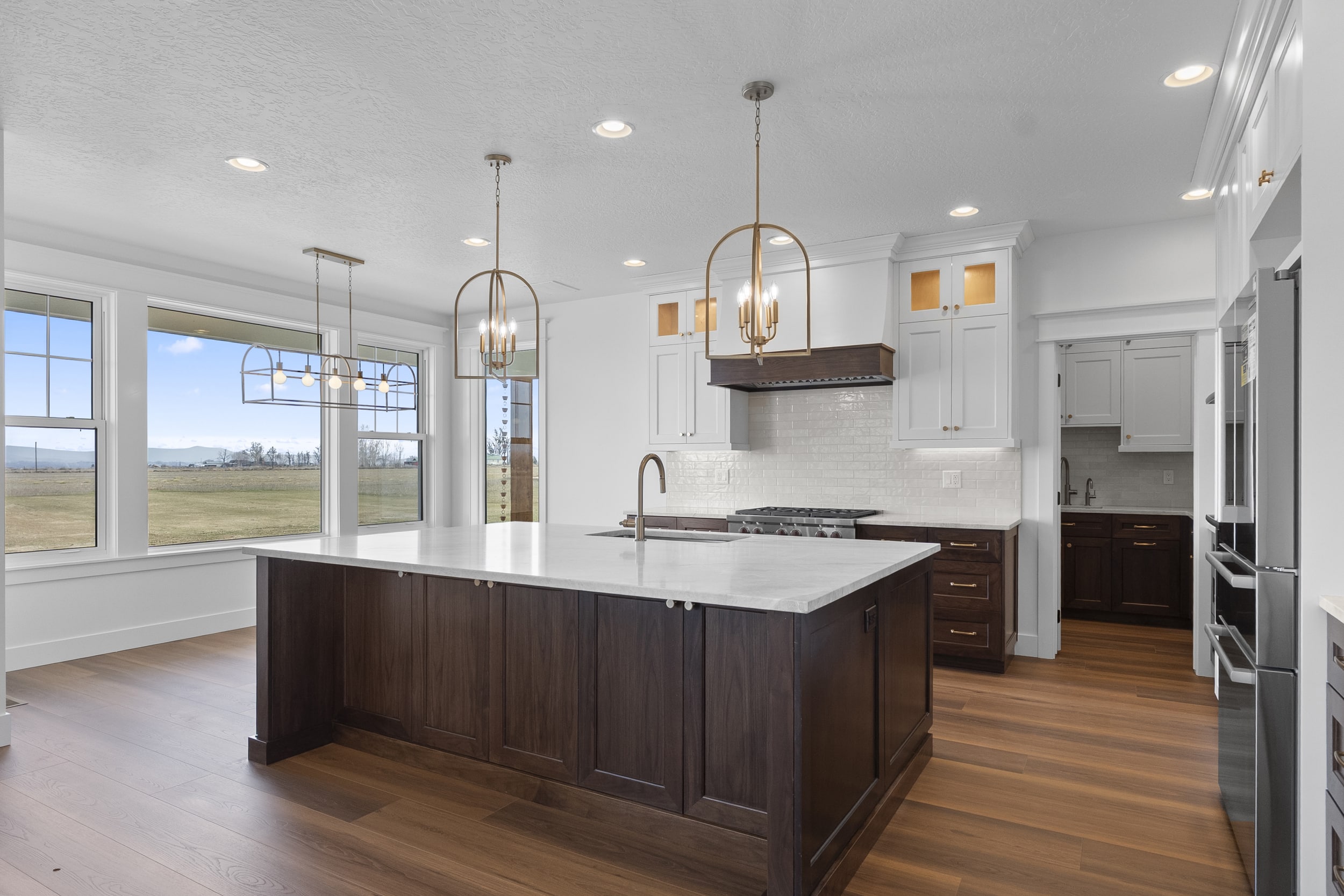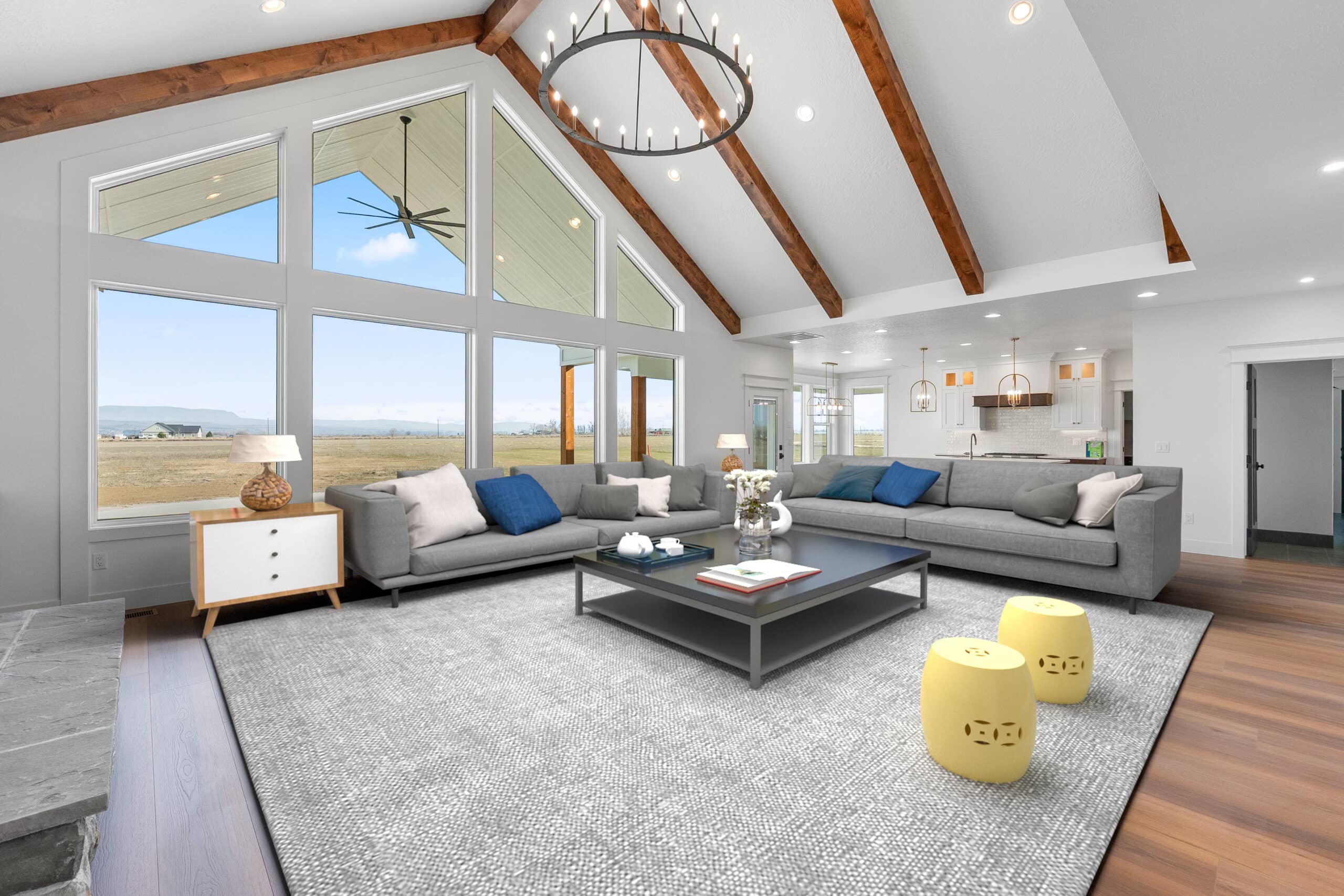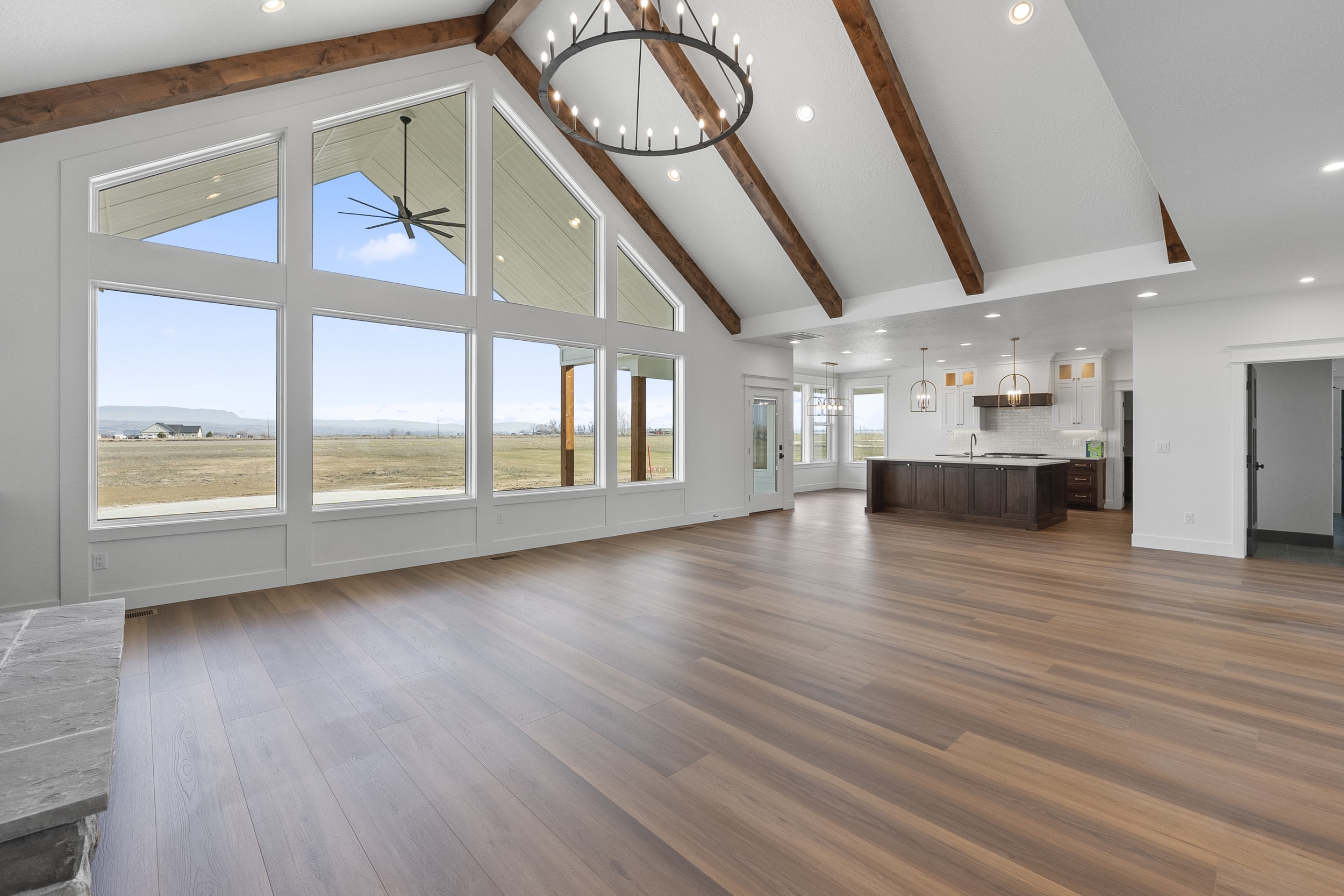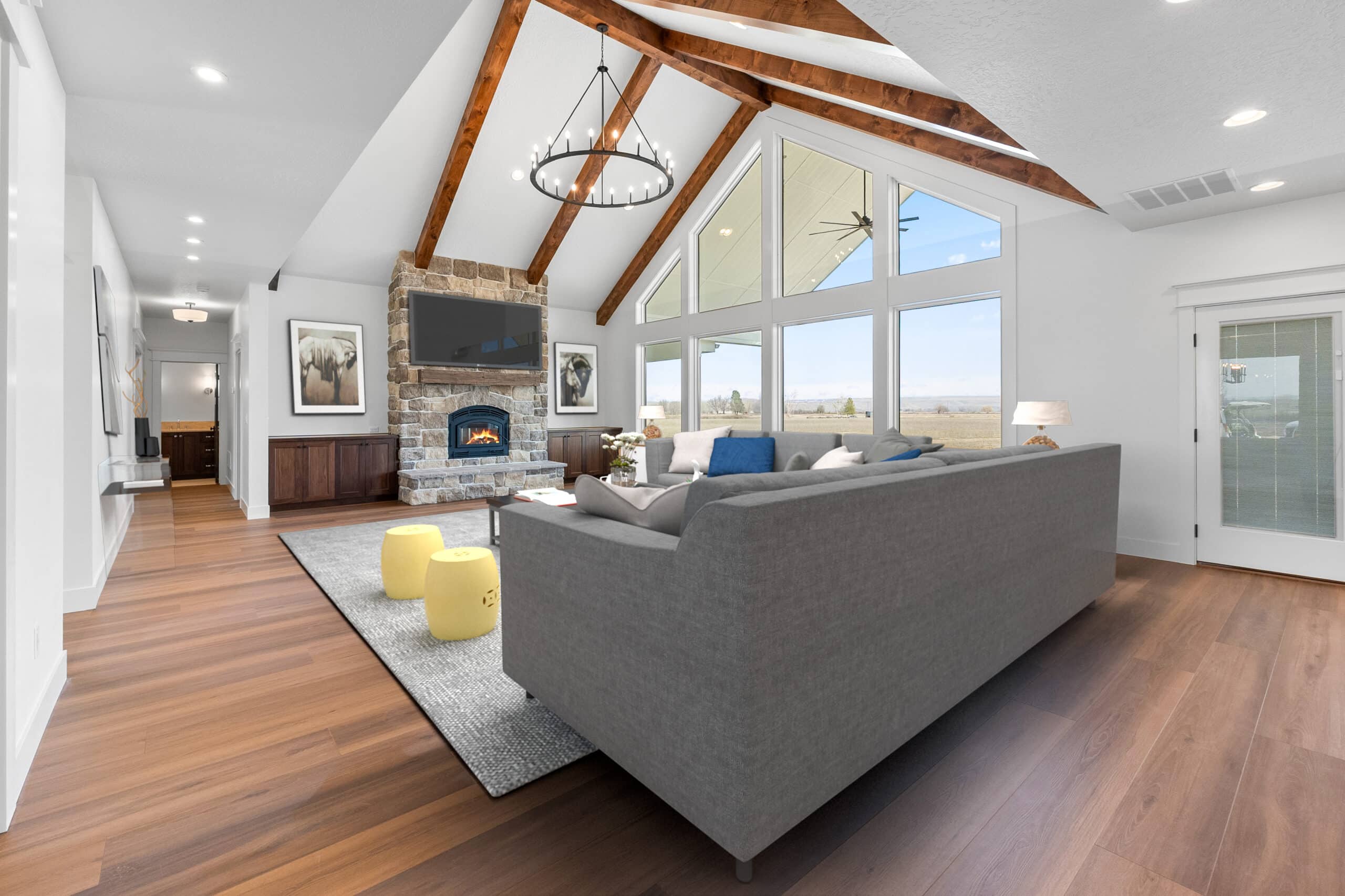 The home’s open-concept layout centers around a stunning vaulted great room with exposed wood beams and expansive windows, allowing natural light to fill the space while capturing views of the surrounding countryside. The custom kitchen is both elegant and highly functional, featuring white oak cabinetry and premium Wolf appliances, making it ideal for entertaining or everyday living.