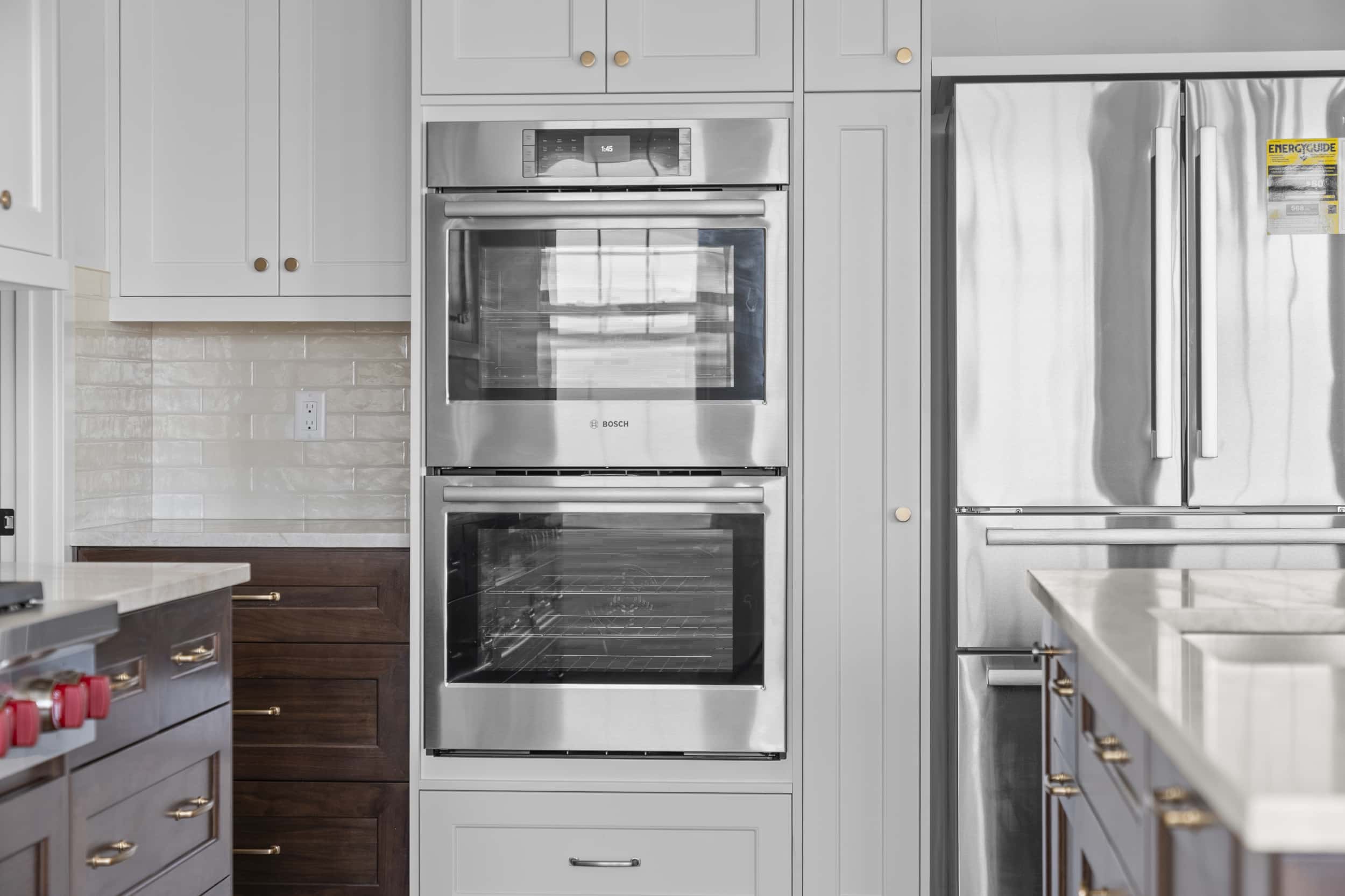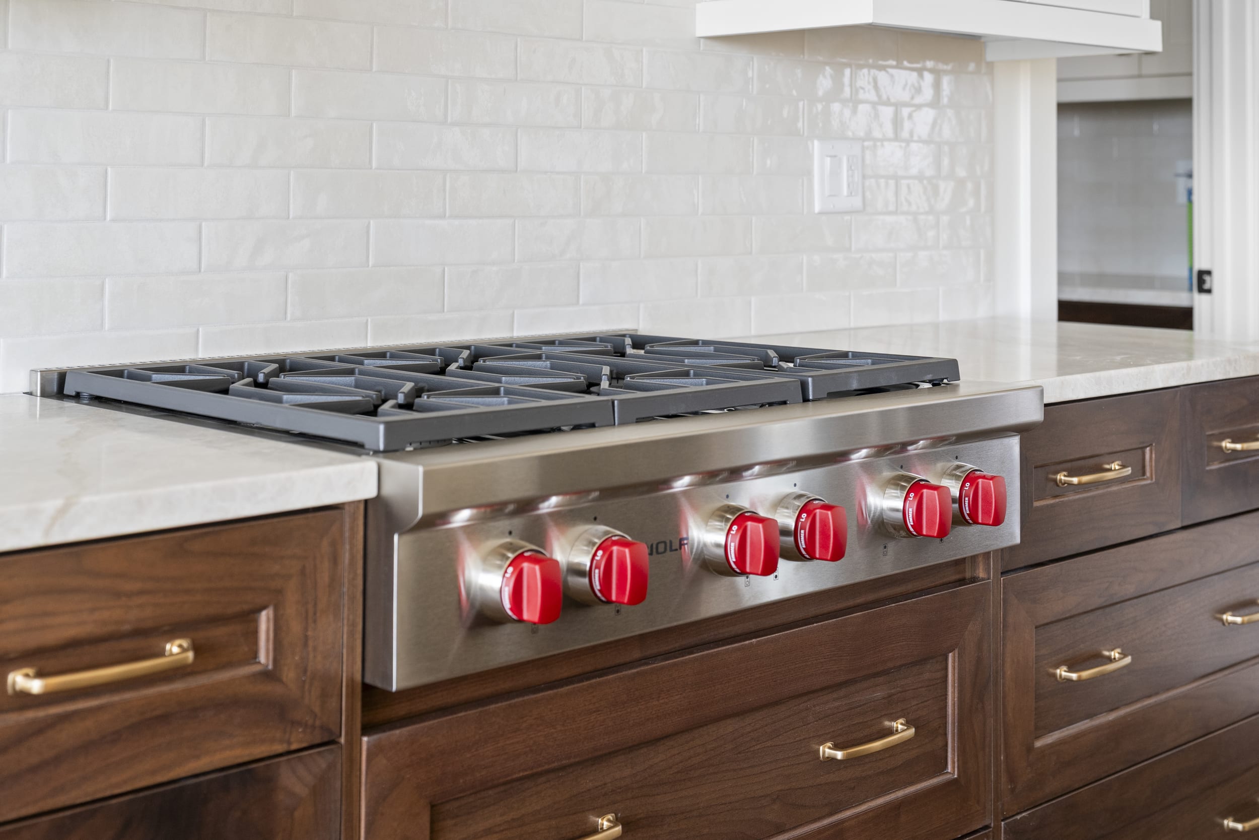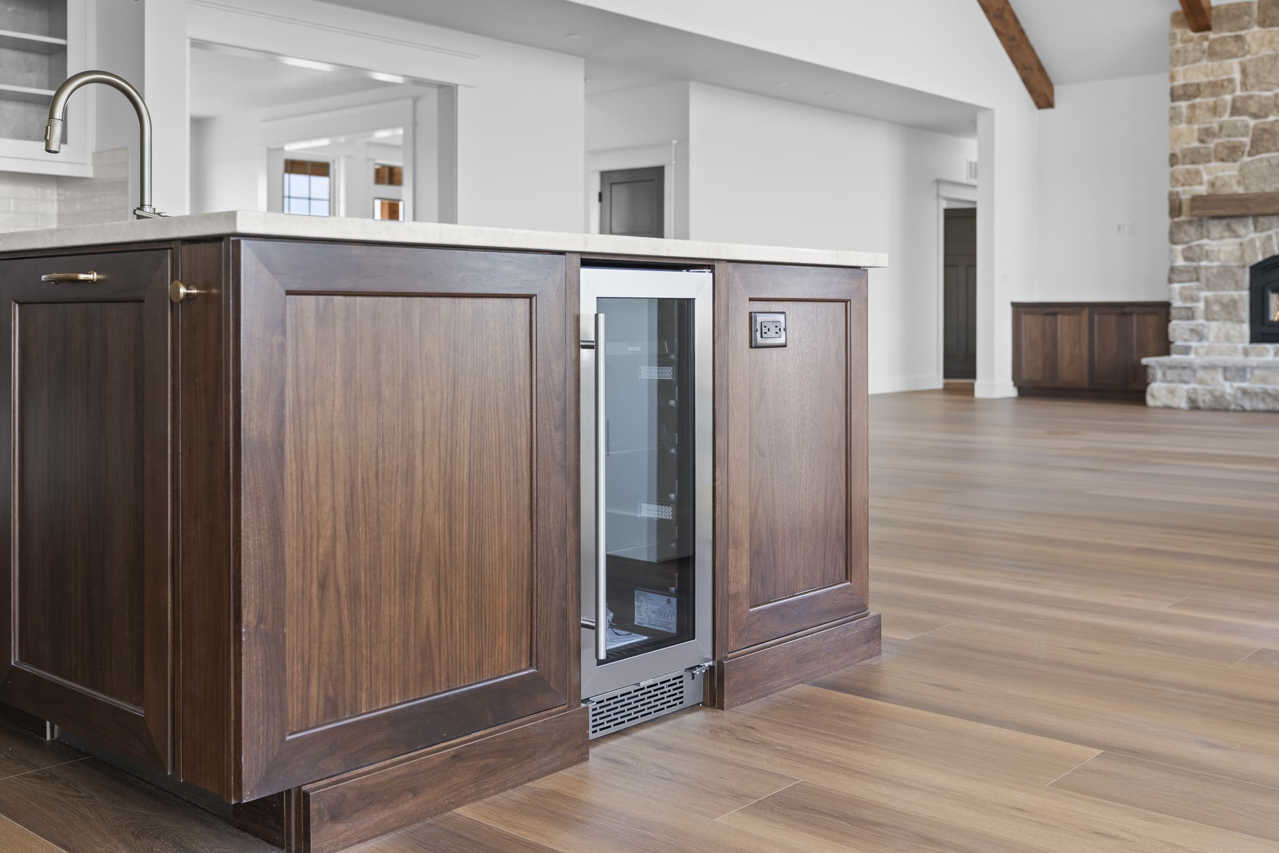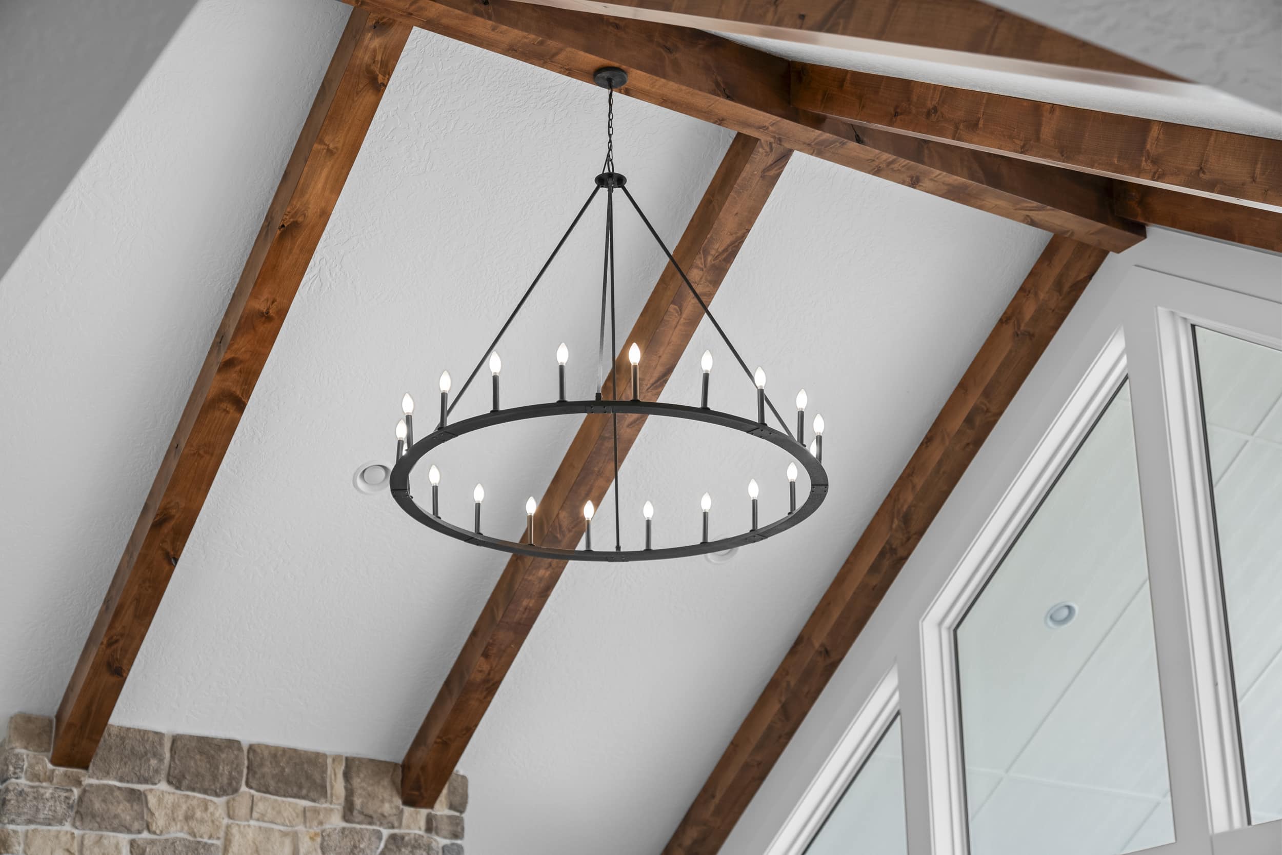 The home’s open-concept layout centers around a stunning vaulted great room with exposed wood beams and expansive windows, allowing natural light to fill the space while capturing views of the surrounding countryside. The custom kitchen is both elegant and highly functional, featuring white oak cabinetry and premium Wolf appliances, making it ideal for entertaining or everyday living.